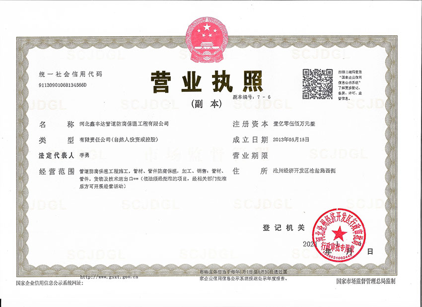 河北鑫豐達(dá)管道防腐保溫工程有限公司坐落于滄州市開(kāi)發(fā)區(qū),通過(guò)ISO9000質(zhì)量管理體系認(rèn)證。本廠擁有工程師4名、技術(shù)人員30名,員工60人,注冊(cè)資金5500萬(wàn)元。專門從事3pe/2pe防腐鋼管、保溫防腐鋼管、防腐螺旋鋼管、水泥砂漿防腐鋼管、等配套工程施工,以及防腐材料研發(fā)制造的大型專業(yè)化企業(yè)。是河北省防腐保溫行業(yè)協(xié)會(huì)理事單位。年生產(chǎn)能力500萬(wàn)平方米。